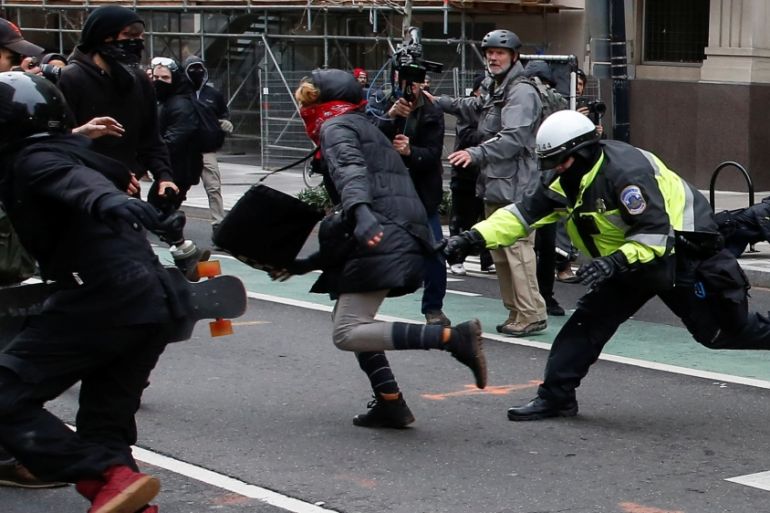 A police officer tries to tackle a protester demonstrating against US President Donald Trump on the sidelines of the inauguration [File: Adrees Latif/Reuters]