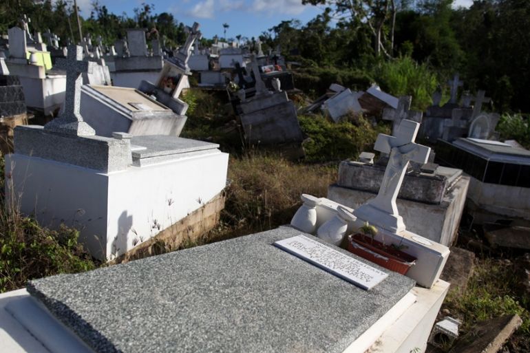 ![Graves destroyed during Hurricane Maria in September 2017, are seen at a cemetery, in Lares, Puerto Rico February 8, 2018. Picture taken February 8, 2018. [Alvin Baez/Reuters]](https://www.aljazeera.com/wp-content/uploads/2018/05/88e3b881b327417ca6713d062146b6c6_18.jpeg?resize=770%2C513&quality=80)