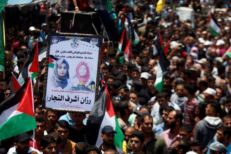 ![A colleague of Al-Najjar reacts to news of her death at a hospital in southern Gaza [Ibraheem Abu Mustafa/Reuters]](https://www.aljazeera.com/wp-content/uploads/2018/07/dc80f127081b44fdaf52a50e4ce4b271_18.jpeg?quality=80)