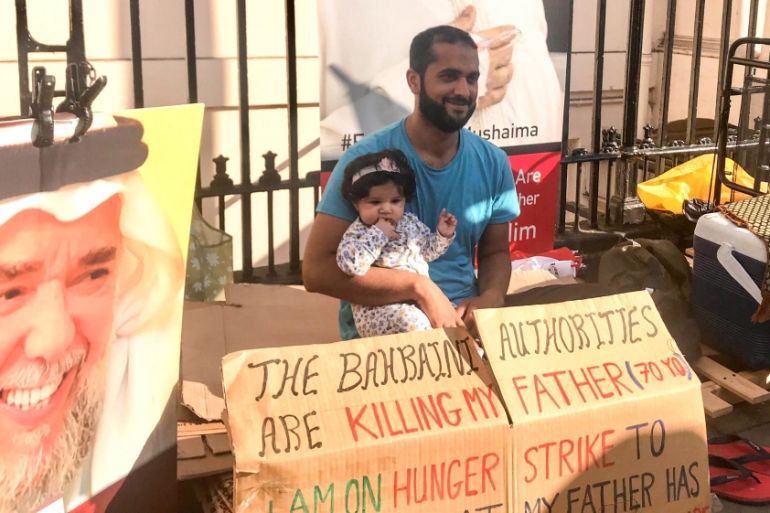 A Bahraini man’s hunger strike against his father’s “torturous” life sentence in the Gulf state has entered its third week in London.