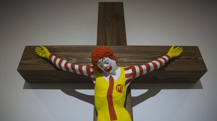 An art exhibit in Israel featuring a crucified Ronald McDonald – a primary mascot of the McDonald’s fast-food restaurant chain – has sparked protests by the country’s Arab Christians.