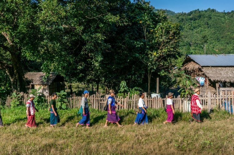 Karen women walk through a village in the Salween Peace Park, Mutraw District [Matias Bercovich/Global News Insight]