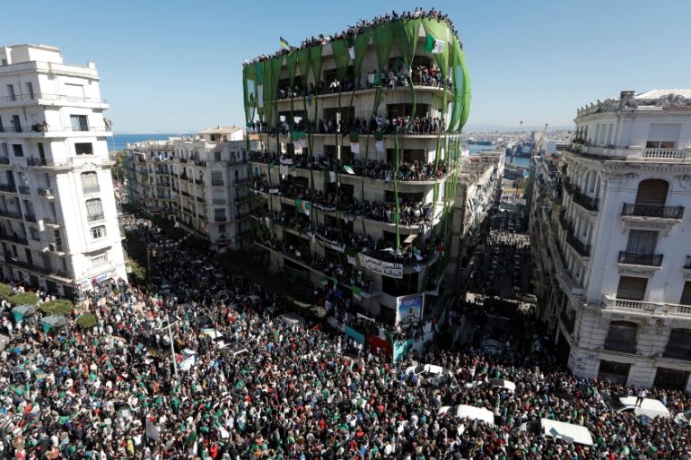 Crowds gather at capital Algiers’ landmark Grand Poste square, demanding the president step down.