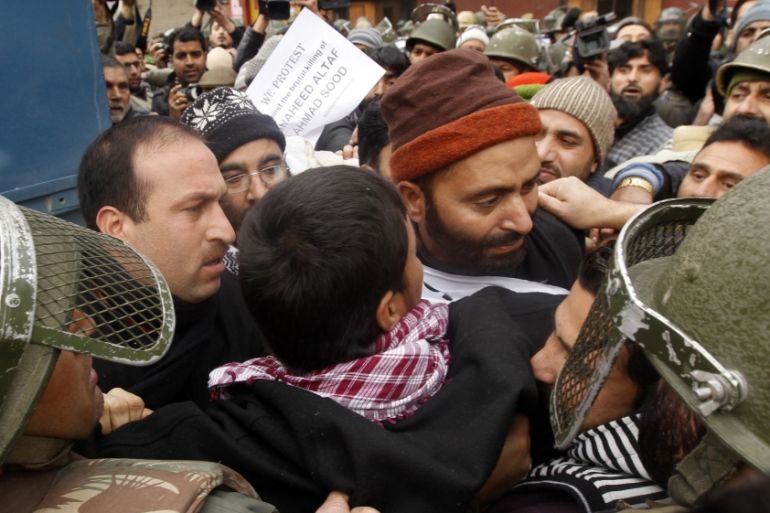 Malik, centre - wearing cap, was arrested as part of a wider assault in Jammu and Kashmir by Indian authorities [Fayaz Kabli/Reuters]