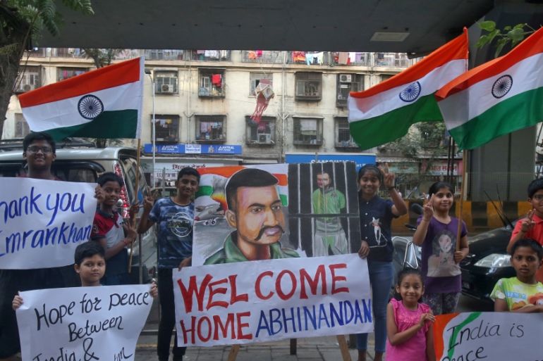 Children hold banners and Indian national flags after Pakistan''s PM Imran Khan said Pakistan will release an Indian Air Force pilot on Friday, in a street in Mumbai