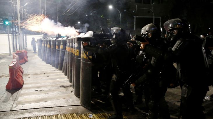 Kompas TV, an Indonesian news channel, showed protesters throwing rocks, facing off against hundreds of riot police in a neighbourhood in the centre of the capital.
