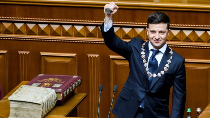 Volodymyr Zelenskyy, 41, dissolves parliament in his inauguration speech.