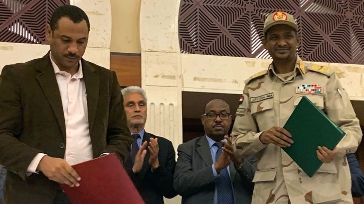 The two sides signed the document after intense overnight talks in the capital, Khartoum, over the details of an agreement reached earlier this month to establish a joint military-civilian sovereign council that will rule the country by rotation.