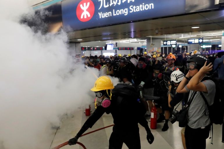 Police with riot shields faced off at the station entrance against a group of remaining protesters, who sprayed a firehose and spread soap on the floor to slow a police approach, while piling up rubbish bins, a wheelchair and umbrellas in a makeshift blockade.