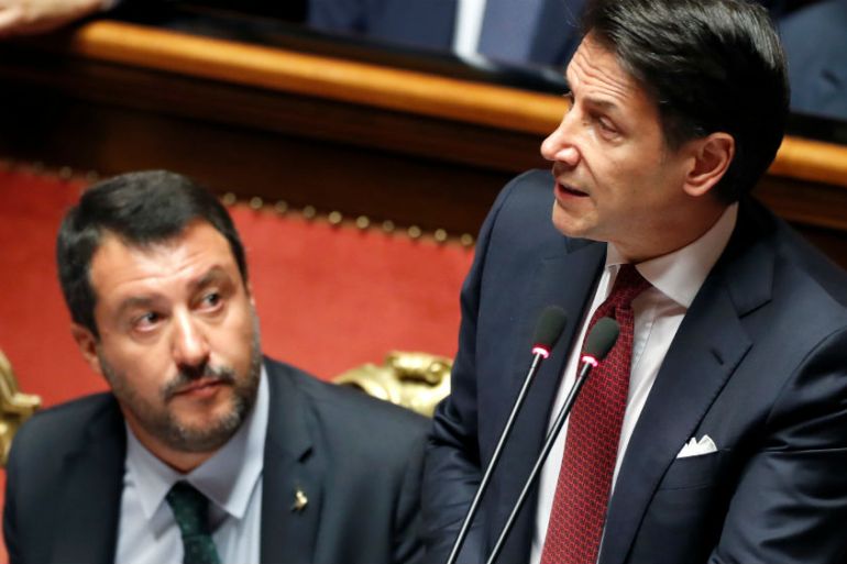 “It is irresponsible to initiate a government crisis … [Salvini] has shown that he is following his own interests and those of his party,” he told a packed senate, one of the two chambers of parliament, with a stony-faced Salvini sitting by his side.