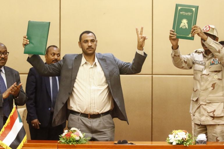 General Mohamed Hamdan Dagalo, the deputy head of the Transitional Military Council (TMC), and Ahmed Rabie, a protest leader, signed the declaration on Sunday at a ceremony in the capital, Khartoum, that was attended by African Union and Ethiopian mediators.