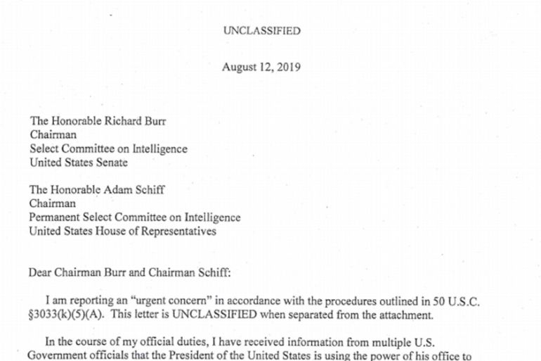 House intelligence committee releases redacted version of whistle-blower complaint at centre of Trump impeachment probe.