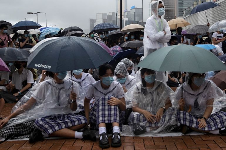 Hong Kong, China – As young people in Hong Kong went back to school, more than 1,000 secondary students joined a rally in the heart of the city, huddling under canopies and trying to stay dry despite torrential downpours.