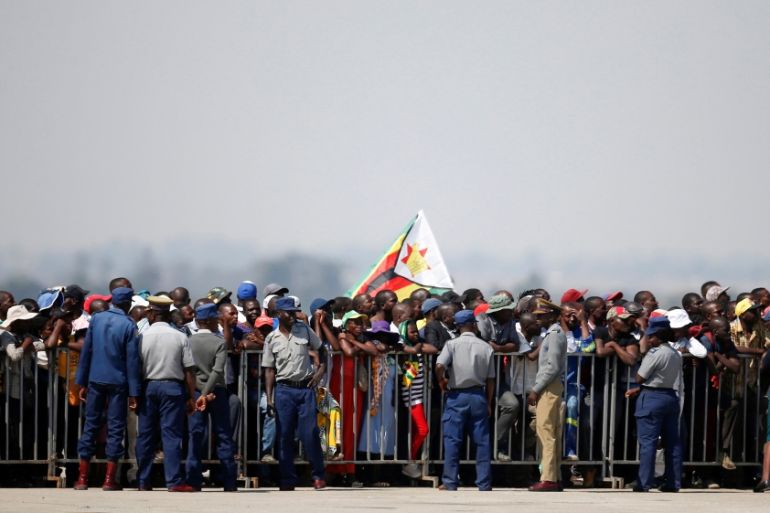 Thousands of Mugabe’s supporters showed up at the airport, wearing shirts with his face. A convoy of vehicles with number plates bearing the letters “RG Mugabe” and the former leader’s signature was also on the runway.
