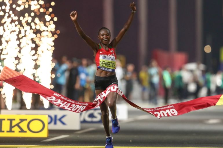Kenyan overcomes Qatari capital’s heat and humidity to win race at World Athletics Championships.