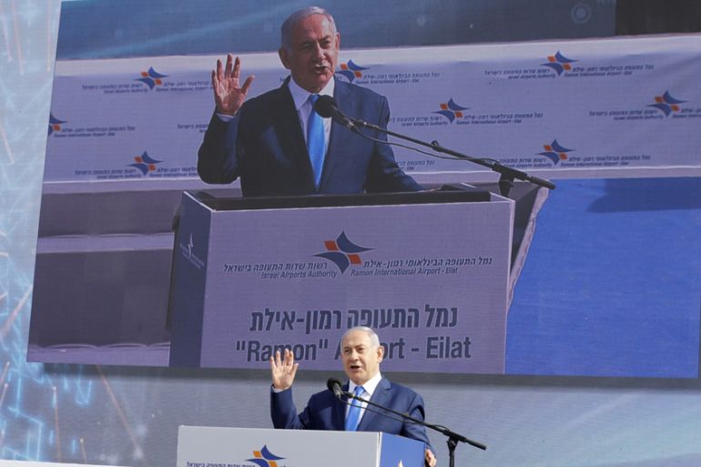 “Ramon airport, this is Arkia 683, we’re very excited,” Netanyahu said from the cockpit on arrival in an exchange with the tower relayed over loudspeakers.