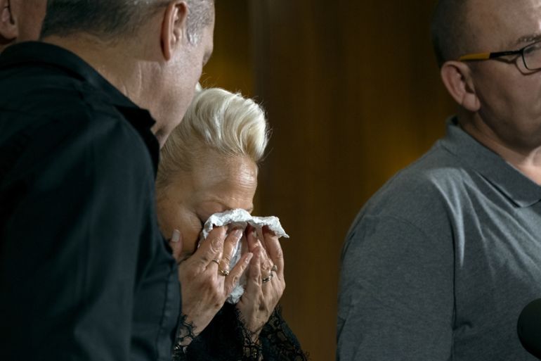 Charlotte Charles, mother of Harry Dunn, wipes her eyes at a news conference on Monday [Craig Ruttle/The Associated Press]