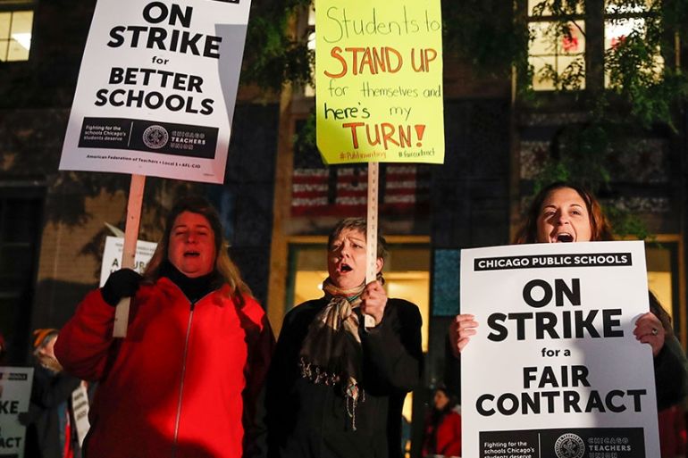 CTU President Jesse Sharkey said the teachers are striking to create “the schools our students deserve”, which would include increased support staff such as teachers’ assistants, nurses, librarians and social workers to “address high levels of trauma among students”.
