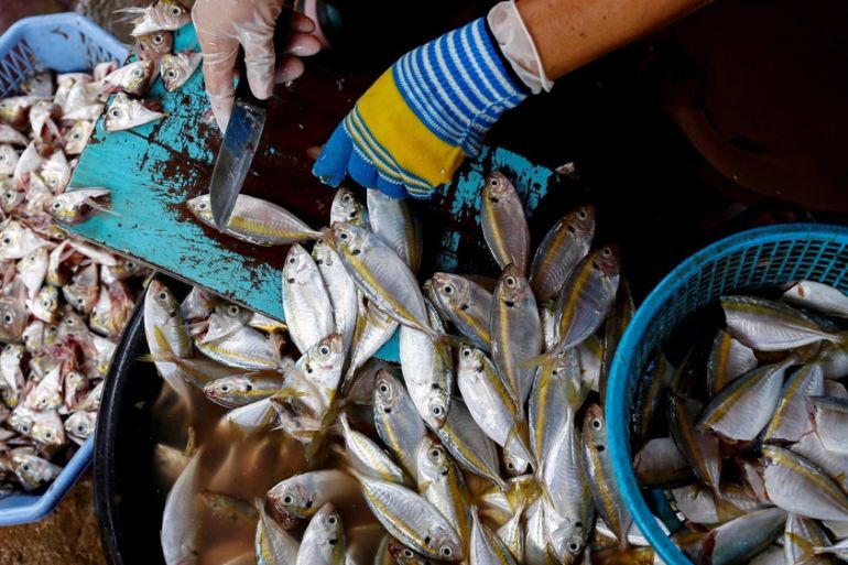 A woman works on fish before they are delivered to Anurak Sareuthai