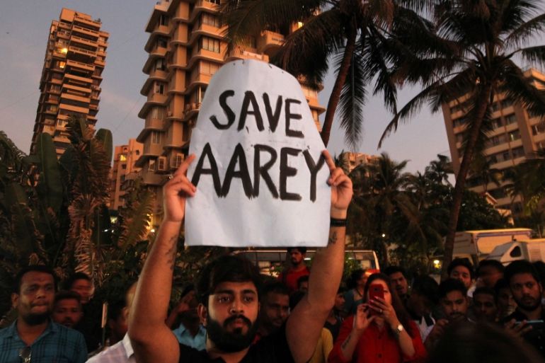 Officials have defended the construction, saying only 30 hectares (74 acres) of the 1,300 hectares (3,212 acres) that make up Aarey – a lush, green oasis close to the Sanjay Gandhi National Park – were being cleared.