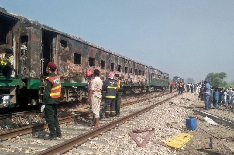 Islamabad, Pakistan – At least 73 people were killed and 48 others injured after a fire engulfed a train travelling through central Pakistan, completely destroying at least three coaches, officials said.