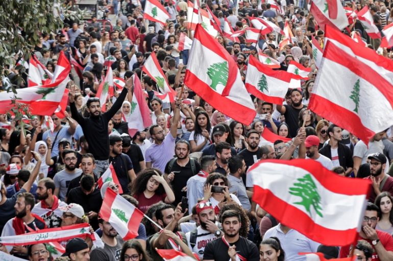 Lebanese protesters wave national flags during demonstrations to demand better living conditions and the ouster of a cast of politicians who have monopolised power and influence for decades, on Octobe