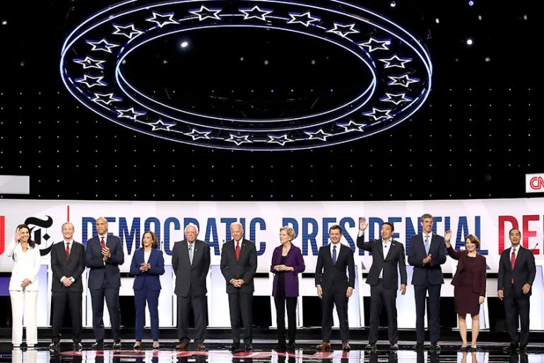 Also on the stage were: Former Vice President Joe Biden, US Senators Cory Booker, Kamala Harris, Amy Klobuchar, Bernie Sanders and Elizabeth Warren, South Bend, Indiana, Mayor Pete Buttigieg, former US Secretary of Housing and Urban Development Julian Castro, former US Representative Beto O’Rourke and entrepreneur Andrew Yang.
