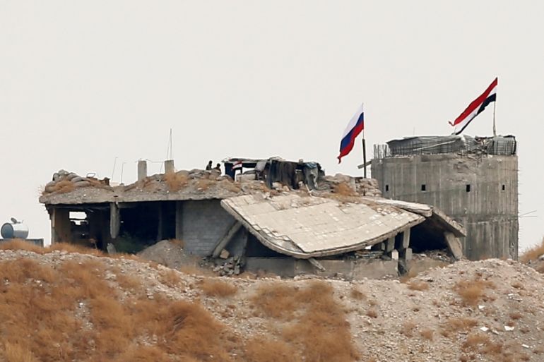 Russian and Syrian national flags are pictured near the northern Syrian village of Zor Magar, as seen from the Turkish border town of Karkamis