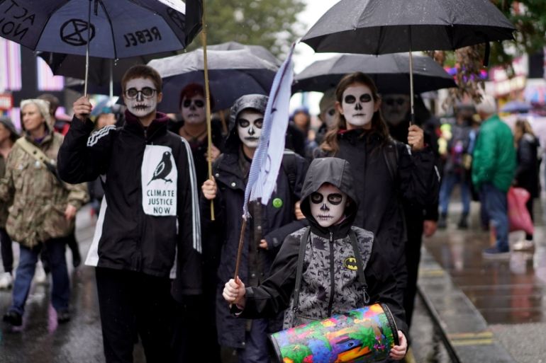 Thousands of people carrying coffins and paper skeletons march in central London to draw attention to climate crisis.