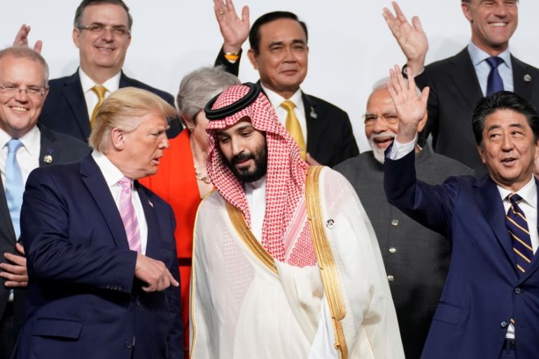 But when the same G20 leaders gathered in Japan‘s Osaka in June, things appeared different. This time, Prince Mohammed stood front and centre in the family photo, sandwiched between Japanese Prime Minister Shinzo Abe and US President Donald Trump, who at a personal breakfast earlier, congratulated the crown prince for doing a “spectacular job” in “opening up” Saudi Arabia and fighting “terrorism”.