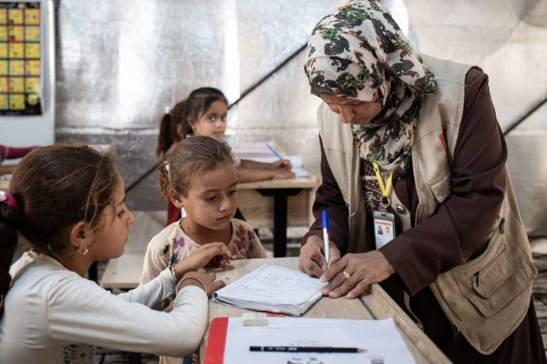 ![Eman, a volunteer teacher giving lessons in Hamam al Alil camp near Mosul [Tom Peyre-Costa/NRC]](https://www.aljazeera.com/wp-content/uploads/2019/10/3aabe4d5506f49679ec0ffbc290a4c89_18.jpeg?resize=770%2C513&quality=80)