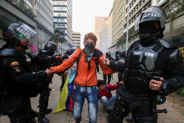 Earlier in the day, thousands had gathered in Bogota’s Bolivar Plaza for a renewed anti-government protest. The recent demonstrations have brought together protesters from nearly all sectors of society, with qualms ranging from recently proposed labour reform and an uptick in the number of killings of indigenous and social leaders to structural problems and corruption that have been part of Colombia for generations.