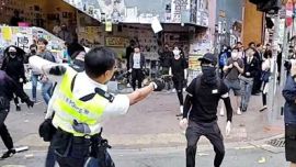 Footage showed a police officer drawing his weapon in the eastern district of Sai Wan Ho as he tried to detain a masked man at a road junction that had been blocked by protesters.