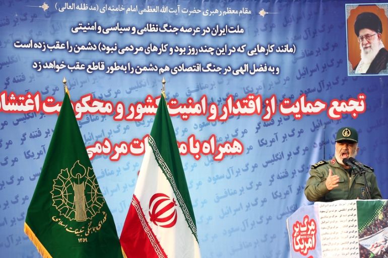At pro-gov’t rally after deadly protests over fuel prices, General Hossein Salami threatens to ‘destroy Iran’s enemies’.