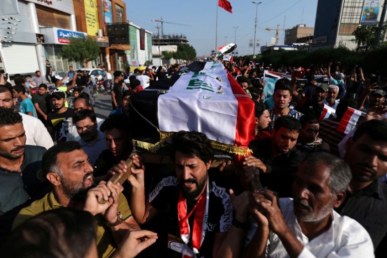 Monday’s deaths were in addition to three protesters who were killed late on Sunday when security forces opened fire on a crowd trying to storm the Iranian consulate in the Shia Muslim holy city of Karbala, security and medical sources said.