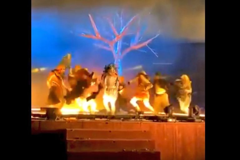 A video tweeted by Al Ekhbariya appeared to show a man in street clothes rushing onto the stage towards a group of costumed performers and then falling to the ground as someone else chased him.