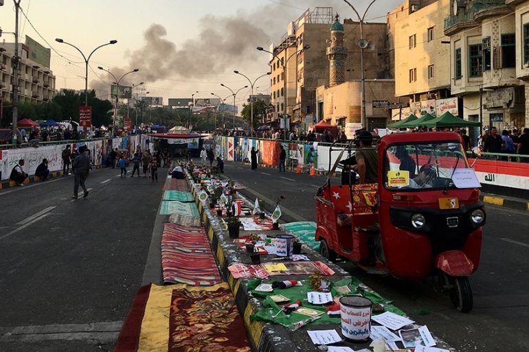 Baghdad, Iraq – On a recent afternoon on the outskirts of Tahrir Square, masked men hailed down and inspected a red tuk-tuk speeding towards the area, in an effort to keep armed civilians from entering the heart of anti-government demonstrations.