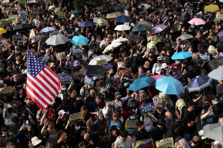 Pro-democracy demonstrators renewed pressure on the government by marching in three separate rallies across the city, with one of them showing “gratitude” for US support of the anti-government movement that has roiled the financial hub for nearly six months.