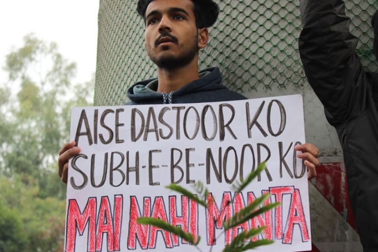 A protester in New Delhi holds a poster carrying the famous lines by Pakistani poet Habib Jalib [Bilal Kuchay/Global News Insight]