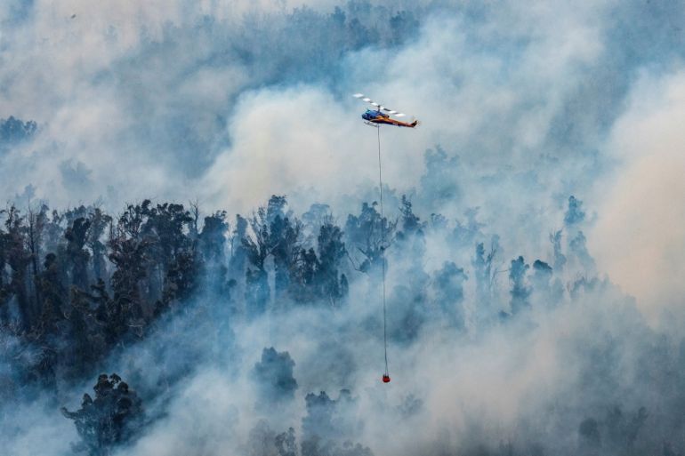 This handout photo taken on December 29, 2019 and received on December 30 from Victoria''s Department of Environment, Land, Water and Planning (DELWP) shows a helicopter dumping water on a fire in Vict