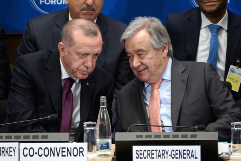 “We need to find a formula to allow [Syrian] refugees … who travelled to Turkey to be resettled in their motherland,” Erdogan told delegates, as he called for a “peace zone in northern Syria”.