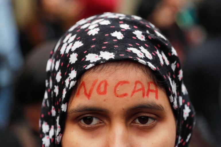 A woman in New Delhi protests against the Citizenship Amendment Act [Adnan Abidi/Reuters]