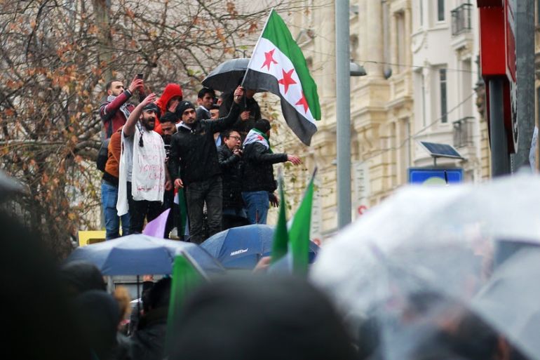 Protesters in Istanbul, including women with their children, held pictures of victims of the attacks, while some brandished a banner that read: “Russia is killing our people and children and the world is not doing anything.”