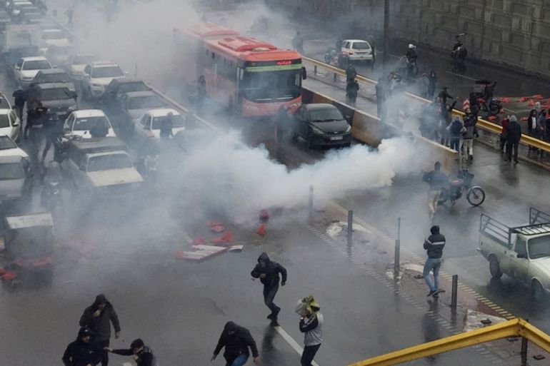 Riot police tries to disperse people as they protest on a highway against increased gas price in Tehran [File: Nazanin Tabatabaee/WANA via Reuters]