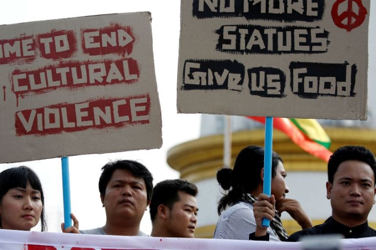Karenni people hold protest at statue of national hero Aung San over lack of progress on ethnic minority peace deal.