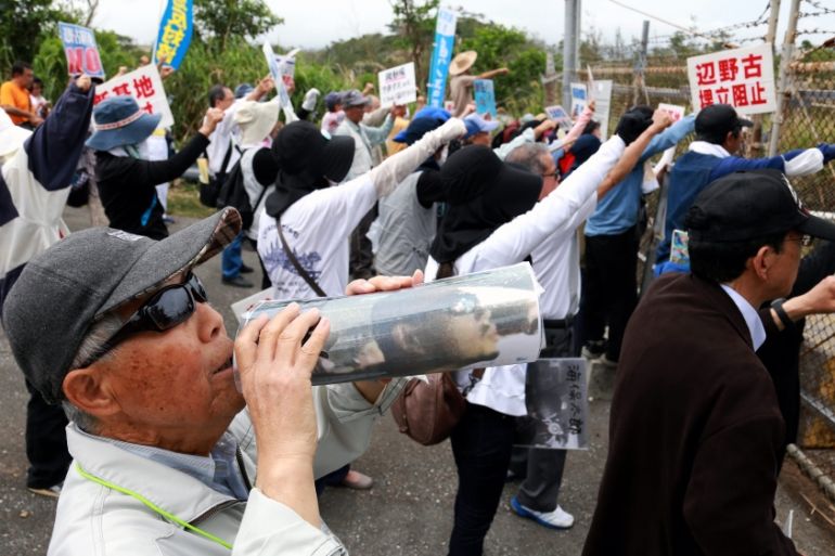 ![Okinawans stage anti-base demonstrations in front of Camp Schwab in Henoko in February 2018 [Lisa Torio/Global News Insight]](https://www.aljazeera.com/wp-content/uploads/2018/02/fb374af57bf14db18bcba4d5cf4935a7_18.jpeg?quality=80)