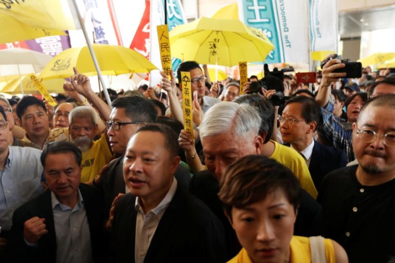 Earlier, as the nine showed up in court, a huge crowd, with people dressed in yellow shirts, chanted “civil disobedience” to show their support. They also raised yellow umbrellas and banners that symbolised the movement.