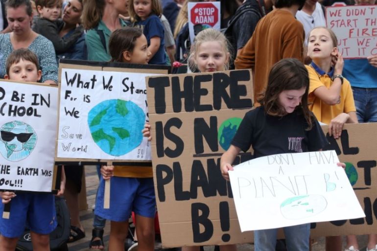 Schoolchildren hold handmade signs at a student-organised protest in Sydney on May 3 [Rick Rycroft/AP Photo]