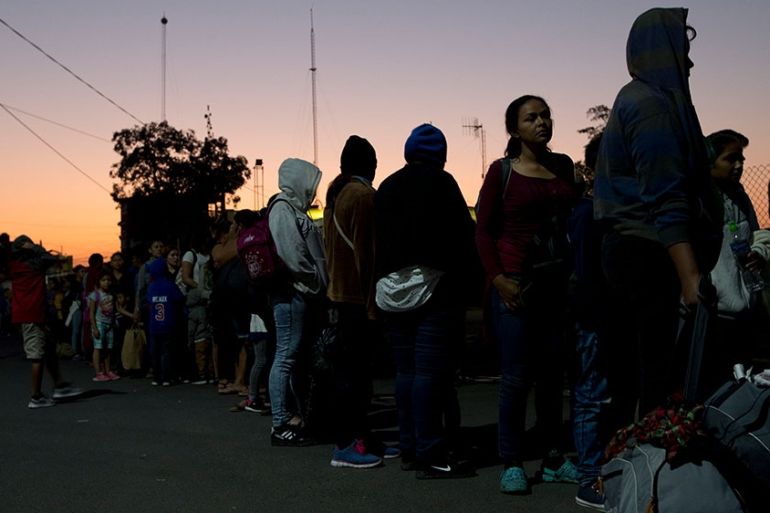 Migrants of Honduras and El Salvador stand in line waiting to enter bridge over the Suchiate River on the border between Guatemala and Mexico, in Tecun Uman, Guatemala [File: Moises Castillo/AP Photo]