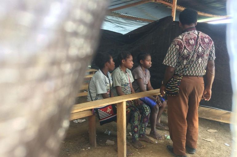Children sit on benches at a temporary school built for those feeling unrest in Nduga [Febriana Firdaus/Global News Insight]